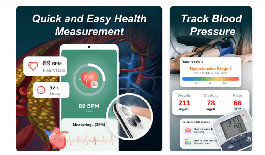🔹 Heart Rate & Stress Check – Place your finger on the camera for a quick heart rate and stress level reading (PPG technology measures blood flow changes).